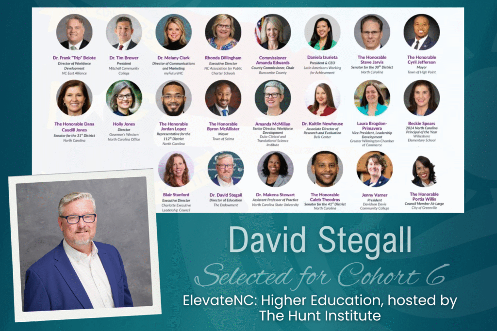 David Stegall, Ed.D., Director of Education, has been selected for Cohort 6 of ElevateNC: Higher Education, hosted by The Hunt Institute.